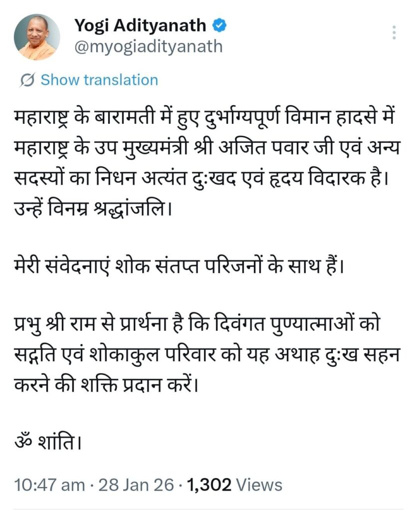 Ajit pawar: सीएम योगी ने डिप्टी सीएम अजित पवार के निधन पर जताया गहरा शोक