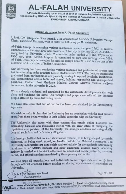 बयान के दौरान ये भी कहा गया है कि अल-फ़लाह विश्वविद्यालय जांच एजेंसियों के साथ पूरी तरह सहयोग कर रहा हैं ताकि इस मामले में एक निष्पक्ष और निर्णायक निष्कर्ष पर पहुंचा जा सके।