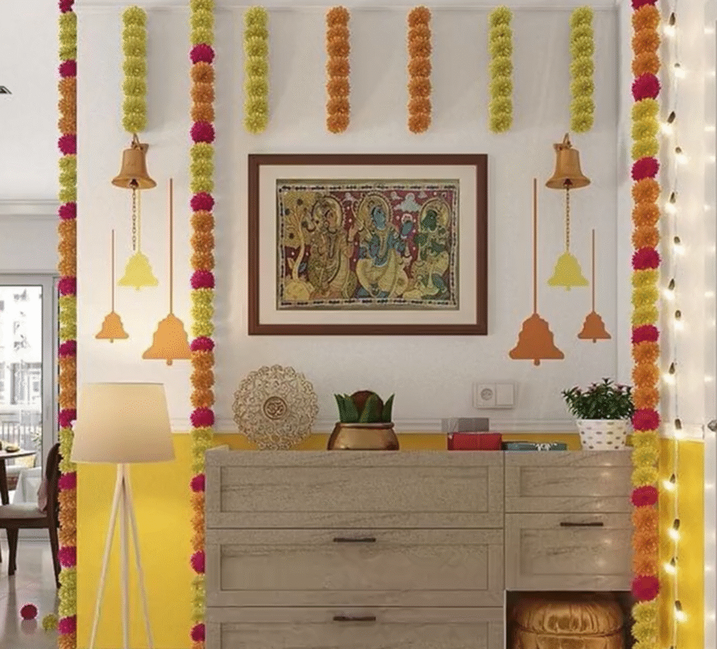 इस दिवाली, आप अपनी हर तस्वीर की खूबसूरती को एक परफेक्ट दिवाली वॉल बनाकर बढ़ा सकते हैं। आप दीवार के एक कोने को गेंदे या गुलाब के फूलों से सजा सकते हैं। इन फूलों के बीच एक हैंगिंग लैंप या छोटी सी माला रखकर आप एक साधारण सजावट बना सकते हैं।