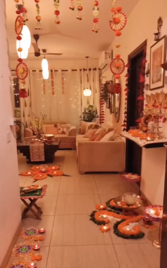 थोड़ी सी रचनात्मकता से आप अपनी दीवारों पर रंगोली के डिजाइन बना सकते हैं। मार्कर या वॉल स्टिकर्स की मदद से आप खूबसूरत रंगोली डिजाइन बनाकर अपने घर को एक अनोखा रूप दे सकते हैं। ये डिजाइन न सिर्फ तस्वीरों में अच्छे लगेंगे, बल्कि आपके घर में एक अनोखा स्पर्श भी लाएंगे।