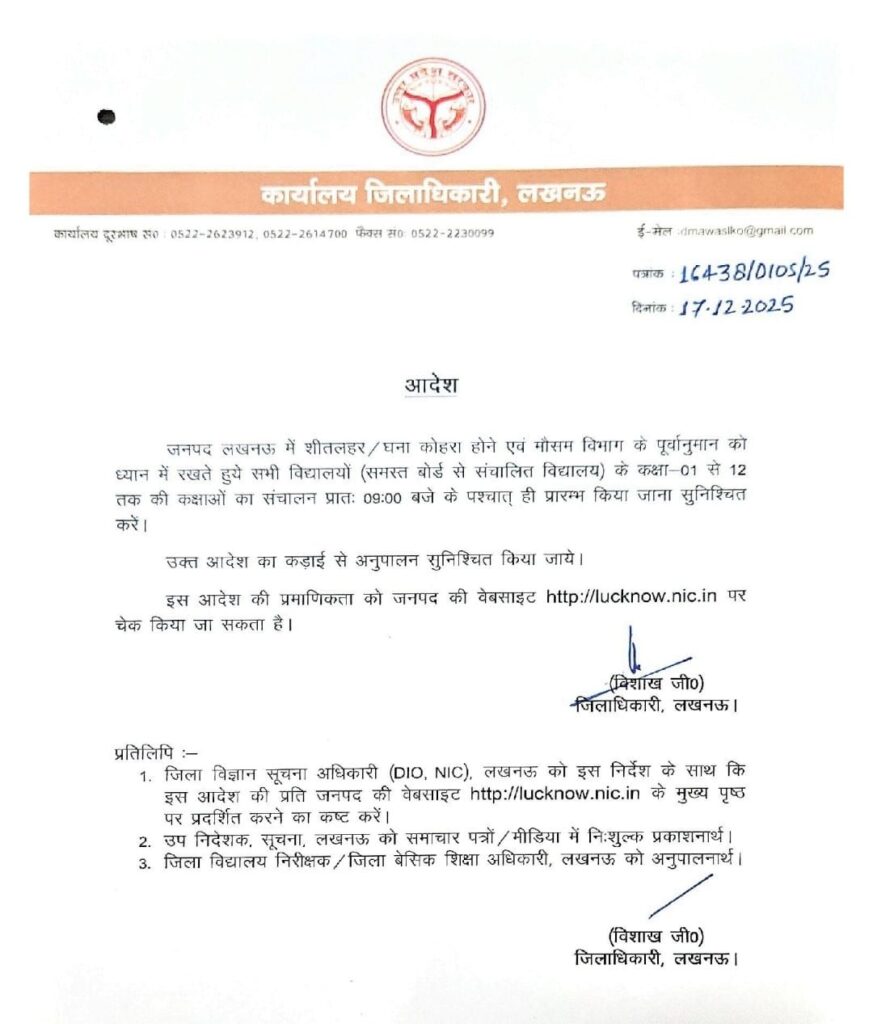 Lucknow:राजधानी लखनऊ जिलाधिकारी विशाख ने शीत लहर घने कोहरे को देखते हुए समस्त बोर्ड से संचालित विद्यालयों के समय में किया परिवर्तन कक्षा 1 लेकर 12 तक संचालित होने वाली क्लासों सुबह 9 बजे संचालित की जाएगी।
