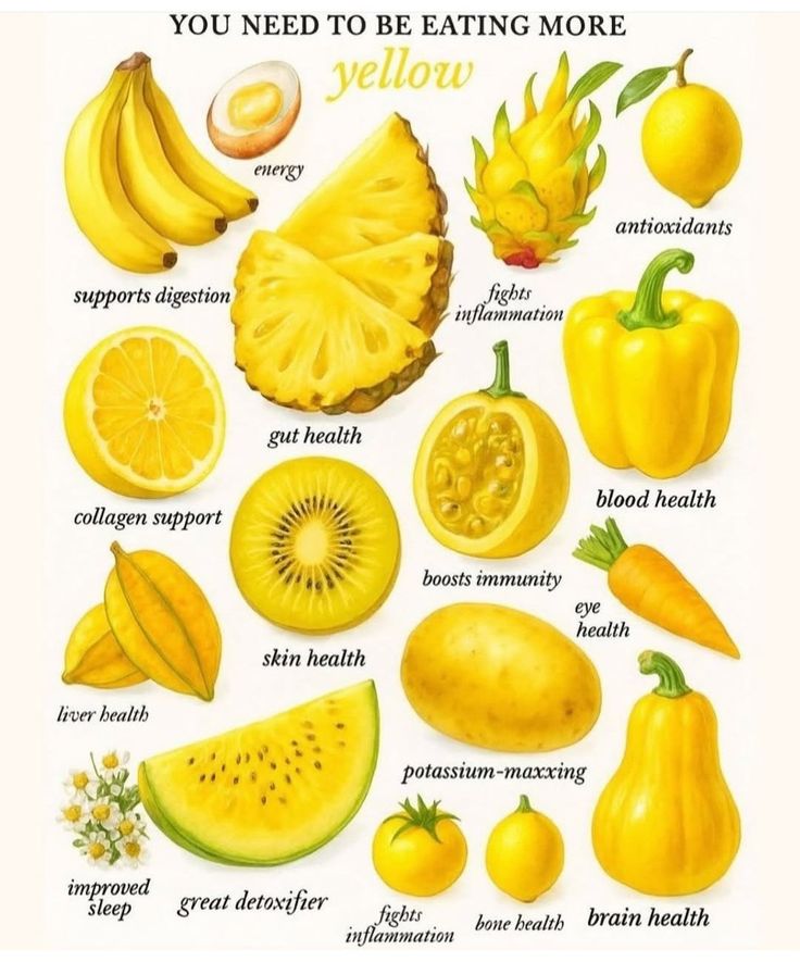 पीले रंग के फल-सब्ज़ियाँ जैसे केला, अनानास, पीली शिमला मिर्च। हल्दी और अदरक जैसी गर्माहट देने वाली चीज़ें।