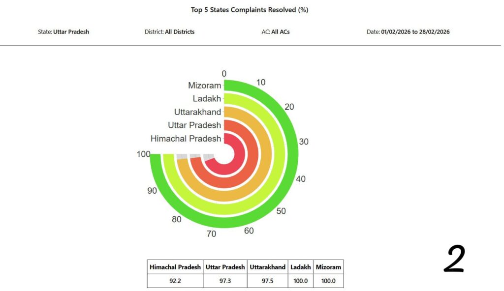मुख्य निर्वाचन अधिकारी ने बताया कि विशेष प्रगाढ़ पुनरीक्षण अवधि में प्रदेश में एनजीएसपी पर माह फरवरी 2026 में 22,469 शिकायतें प्राप्त हुईं, जिसके सापेक्ष कुल 21,864 (97.3 प्रतिशत) शिकायतों का गुणवत्तापूर्ण निस्तारण किया जा चुका है। उन्होंने बताया कि फरवरी माह में शिकायतों के निस्तारण में प्रदेश को पूरे देश में चौथा स्थान प्राप्त हुआ है। उत्तर प्रदेश द्वारा शिकायतों के निस्तारण निश्चित समय अवधि के भीतर करते हुए पूरे देश में उत्कृष्ट प्रदर्शन किया गया है। उत्तर प्रदेश के ऊपर मिजोरम, लद्दाख तथा उत्तराखंड जैसे छोटे राज्य हैं, जहां प्राप्त होने वाली शिकायतों की संख्या बहुत ही कम है। ऐसे में उत्तर प्रदेश द्वारा शिकायतों के निस्तारण के लिए किया गया कार्य सराहनीय है।
