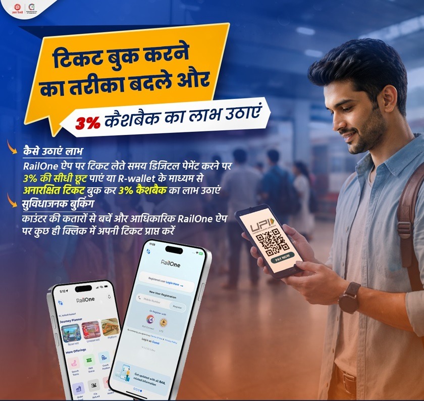 अब इस सुविधा को और विस्तार देते हुए , RailOne ऐप के माध्यम से सभी डिजिटल भुगतान माध्यमों से अनारक्षित टिकट बुक करने पर 3% की छूट प्रदान की जाएगी। यह छूट R-Wallet के अतिरिक्त अन्य सभी डिजिटल भुगतान माध्यमों पर लागू होगी। यह विशेष प्रोत्साहन योजना दिनांक 14.01.2026 से 14.07.2026 तक प्रभावी रहेगी।