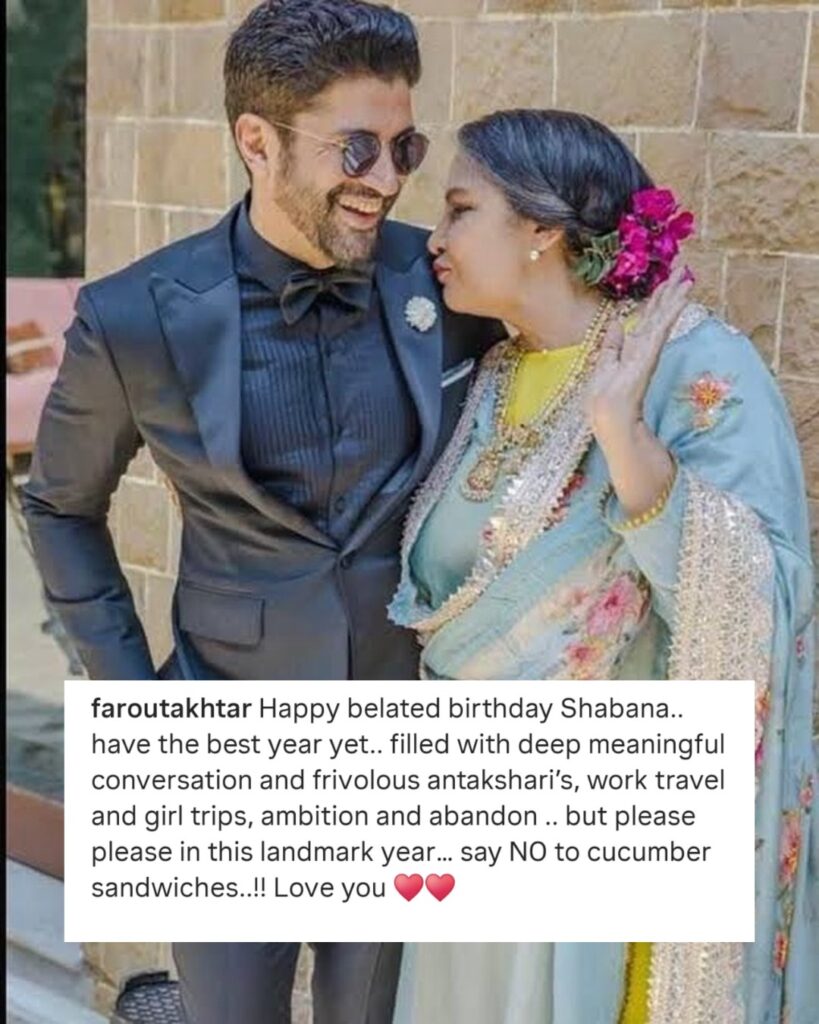 ““शबाना, आपको देर से ही सही जन्मदिन की शुभकामनाएँ… यह साल आपके लिए अब तक का सबसे बेहतरीन साल हो… जो गहरी और मायने रखने वाली बातचीतों, मज़ेदार अंताक्षरी, काम से जुड़े सफ़र और गर्ल्स ट्रिप्स से भरा हो। महत्वाकांक्षाओं और खुलकर जीने के पलों से भरपूर रहे… लेकिन प्लीज़, प्लीज़ इस खास साल में… खीरे वाले सैंडविच को बिल्कुल ‘ना’ कहिए…!!”