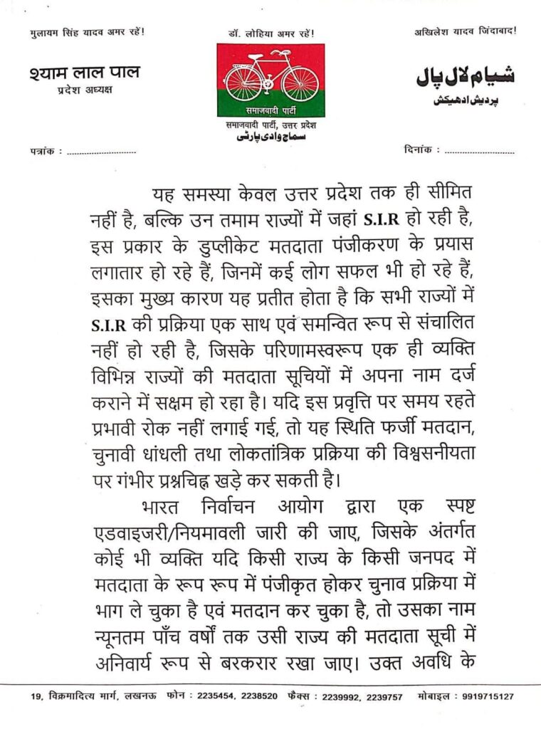 Spa party: समाजवादी पार्टी के राष्ट्रीय अध्यक्ष एवं पूर्व मुख्यमंत्री श्री अखिलेश यादव के निर्देश पर प्रदेश अध्यक्ष श्री श्याम लाल पाल ने मुख्य निर्वाचन अधिकारी उ0प्र0 लखनऊ को ज्ञापन देकर शिकायत की है कि बड़ी संख्या में ऐसे व्यक्ति, जिन्होंने बिहार राज्य की मतदाता सूची में एसआईआर के माध्यम से अपना नाम दर्ज कराया है, तथा वहाँ के चुनावों में मतदान भी किया है, वे पुनः उत्तर प्रदेश के सीमावर्ती जनपदों-विशेषकर बॉर्डर क्षेत्रों में मतदाता सूची के एसआईआर प्रक्रिया के दौरान अपना नाम दर्ज कराने में सफल हो रहे हैं। आशंका है कि उत्तर प्रदेश विधानसभा चुनाव सामान्य निर्वाचन 2027 में ऐसे व्यक्ति यहाँ भी मतदान कर चुनावी प्रक्रिया को प्रभावित कर सकते हैं।
