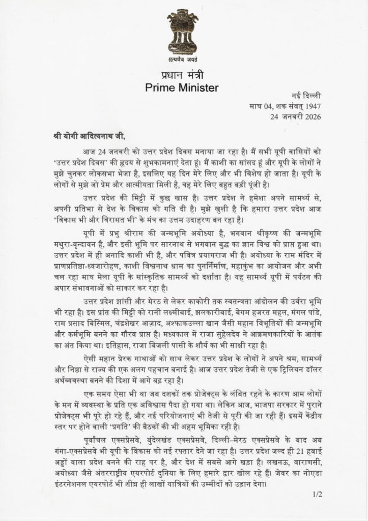 UP Day: लखनऊ यूपी स्थापना दिवस के अवसर पर प्रधानमंत्री द्वारा मुख्यमंत्री योगी आदित्यनाथ को लिखी चिट्ठी ने साफ कर दिया कि उत्तर प्रदेश का नेतृत्व केंद्र के भरोसे पर खरा उतर रहा है। “प्रदेश सुरक्षित और मज़बूत हाथों में है” जैसे शब्द योगी सरकार के कार्यकाल और प्रशासनिक पकड़ की सराहना माने जा रहे हैं।