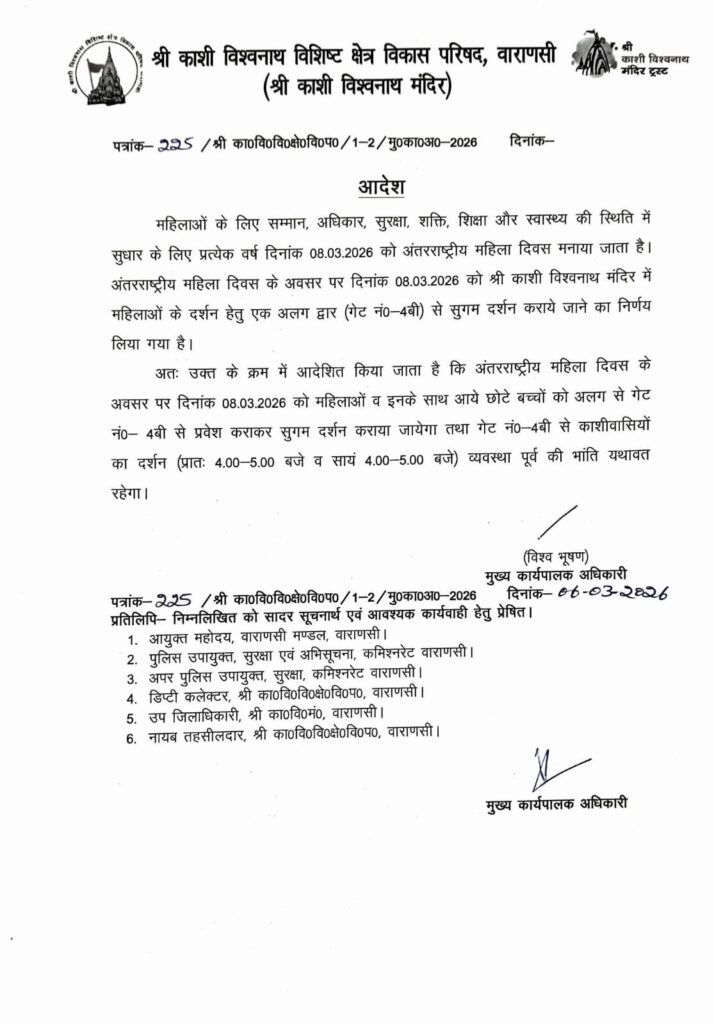 women’s day 2026: वाराणसी काशी विश्वनाथ मंदिर में 8 मार्च अंतरराष्ट्रीय महिला दिवस के अवसर पर महिलाओं और बच्चों के लिए अलग गेट से प्रवेश की विशेष सुविधा होगी।